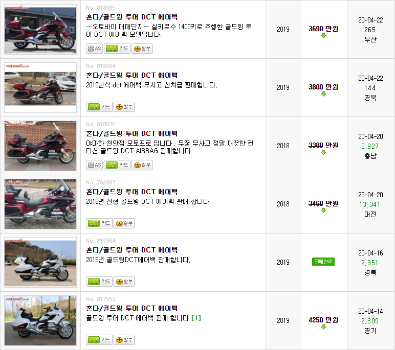 혼다 골드윙 DCT 에어백 중고 가격은 연식에 따라 차이를 보이고 있습니다.